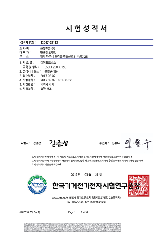 한양전공(주)의 시험성적서를 확인하실 수 있습니다.