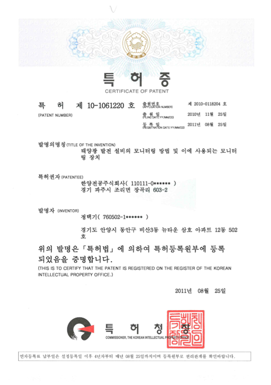 특허증-태양광 발전 설비의 모니터링 방법 및 이에 사용되는 모니터링 장치